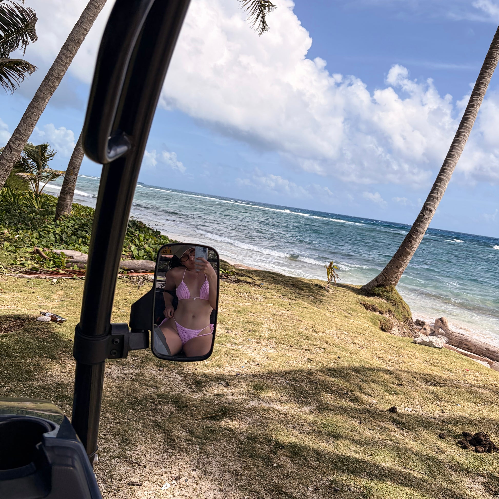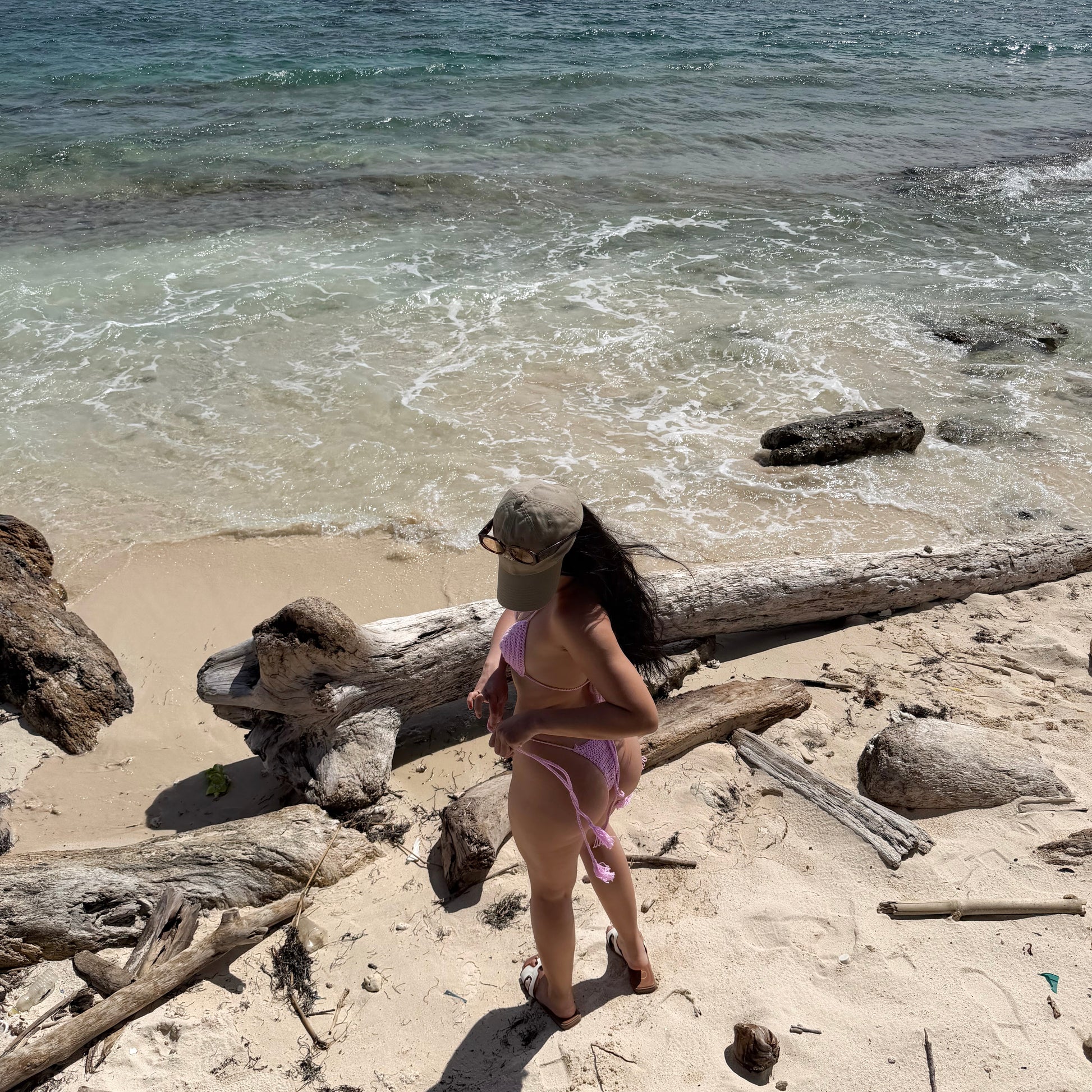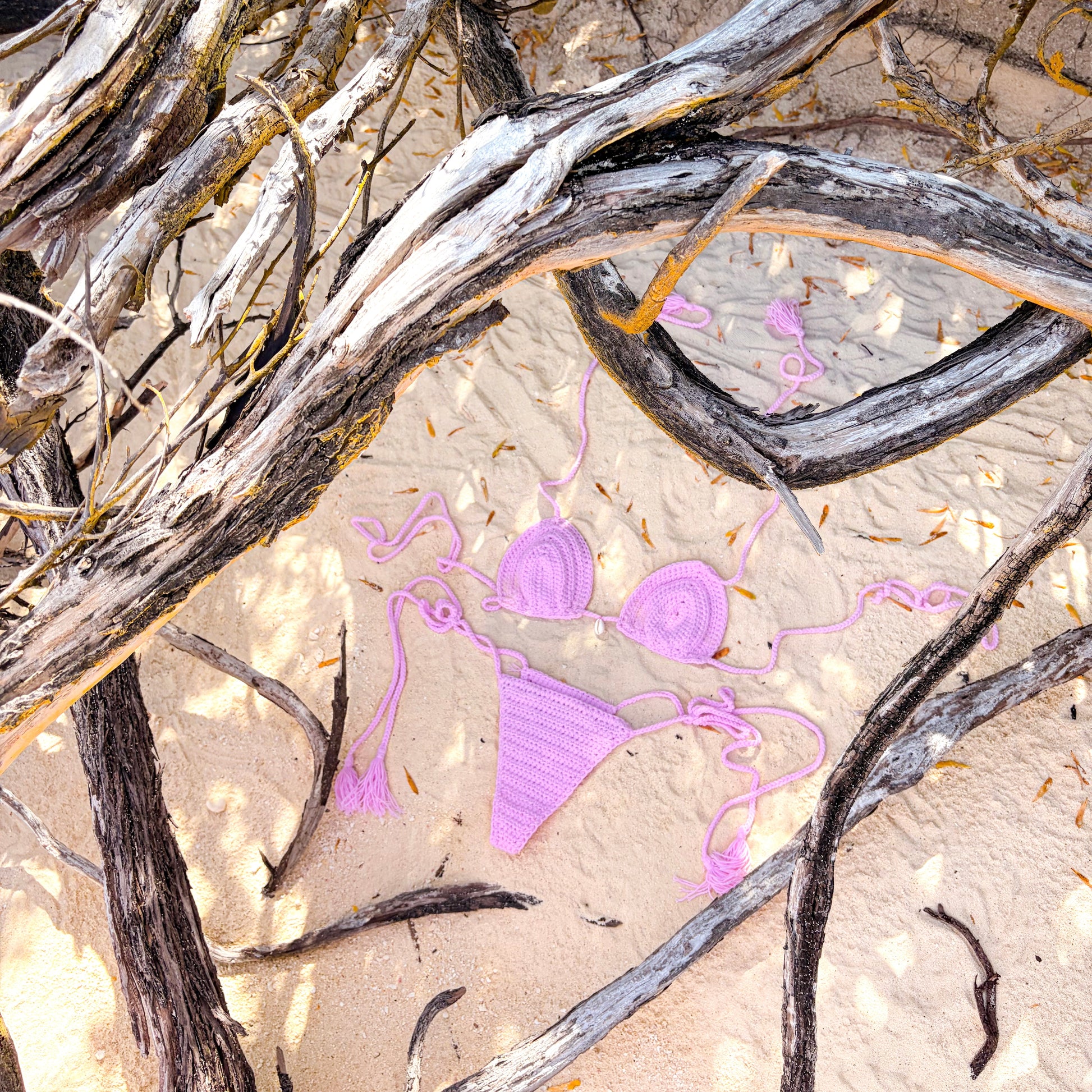 Top triángulo de cobertura media con amarre en cuello y espalda, panty de cobertura media con amarre en los laterales, con detalle de accesorio en la tira del torso no natural que representa el amor por el mar.