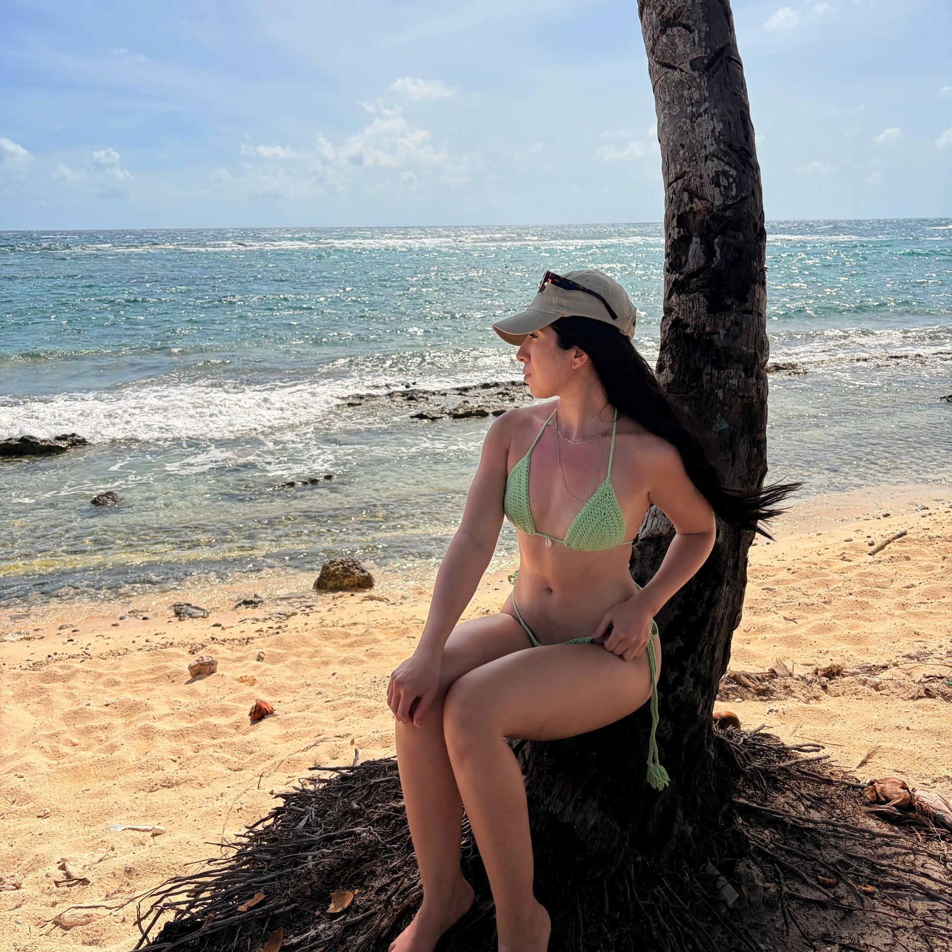 Top triángulo de cobertura media con amarre en cuello y espalda, panty de cobertura media con amarre en los laterales, con detalle de accesorio en la tira del torso no natural que representa el amor por el mar.