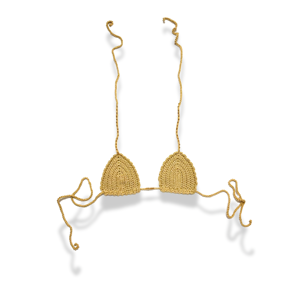 Top triángulo de cobertura media con amarre en cuello y espalda, panty de cobertura media con amarre en los laterales, con detalle de bisutería en sus tiras laterales