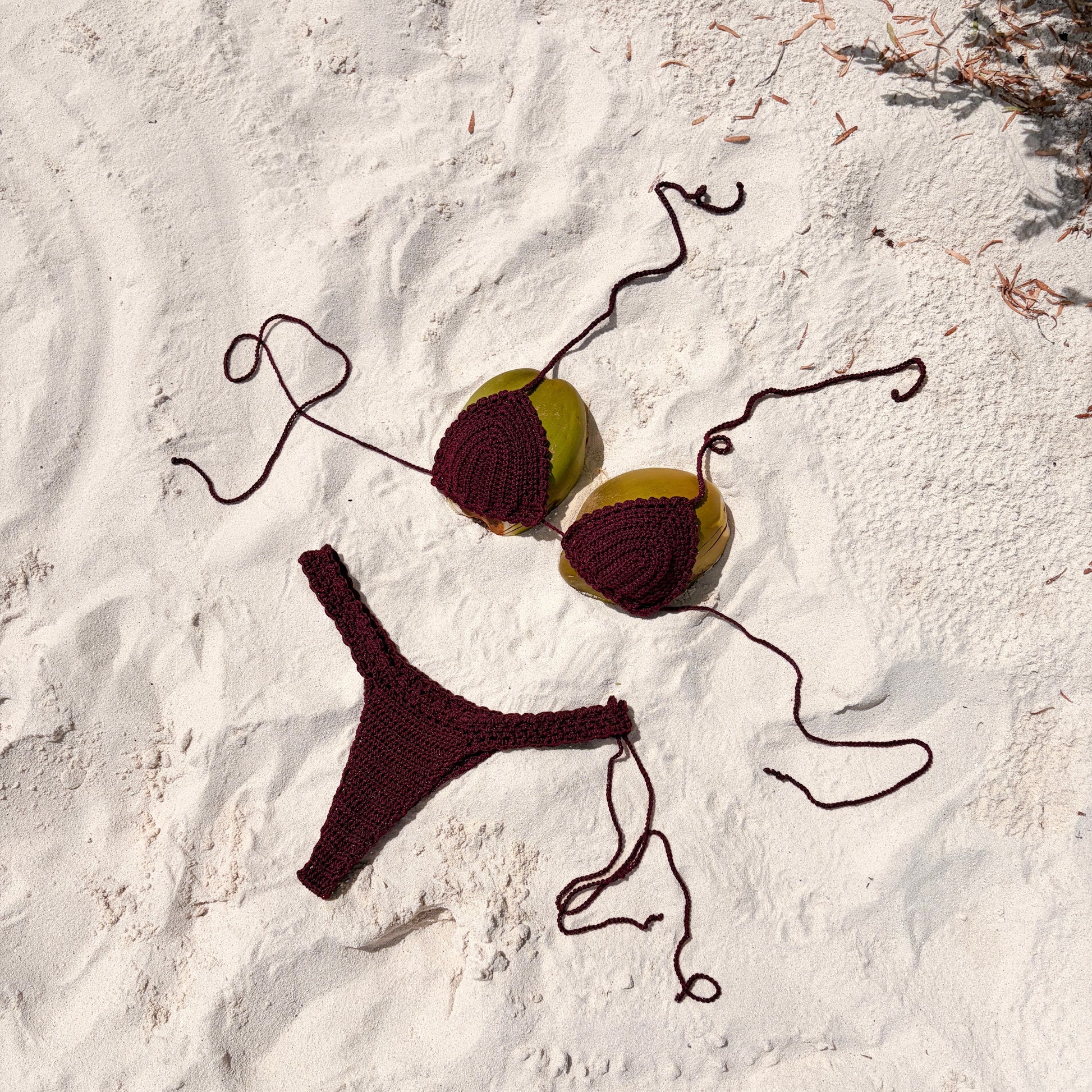 Top triángulo de cobertura media con amarre en cuello y espalda, panty de cobertura media con ajuste lateral